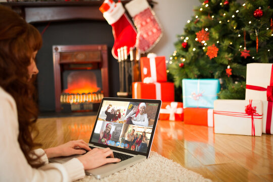 Caucasian woman on christmas laptop video call with diverse group of friends