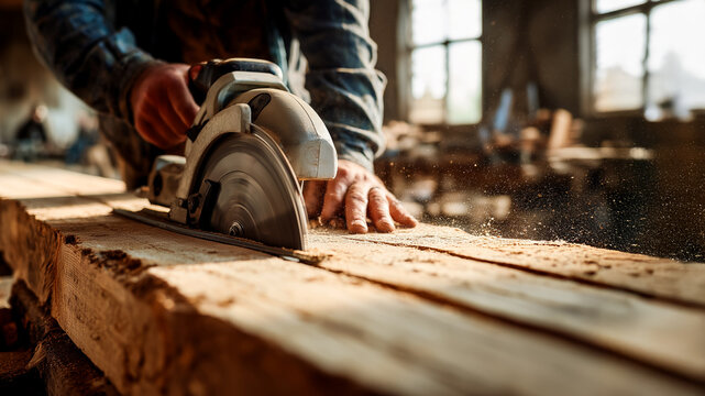 Horizontal photo of good looking handsome happy worker holding tool in both hands, looking directly at camera, smiling sincerely, wearing brown apron, blue overall and yellow helmet. Work concept.