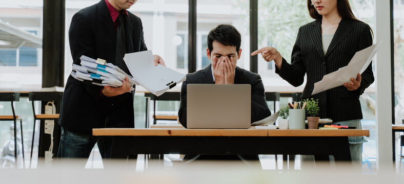 Overwhelmed businessman throws papers in the air in office. Business, stress, frustration concept.