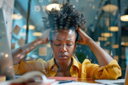Overwhelmed professional experiencing stress and headaches from multitasking, workload challenges, and workplace pressures, leading to burnout and anxiety around deadlines and errors