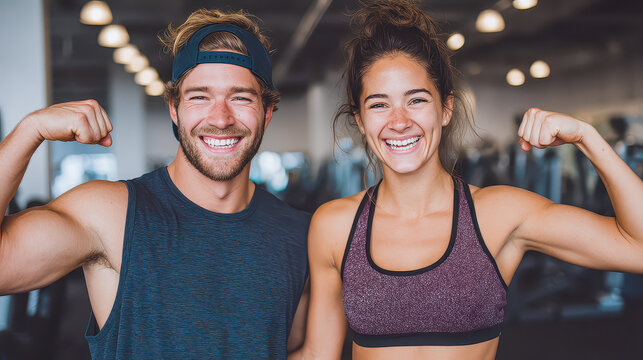 Friends celebrating fitness achievements in a vibrant gym environment during a sunny afternoon workout session