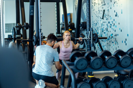 Determined male athlete lifting weights while personal trainer supervises in gym