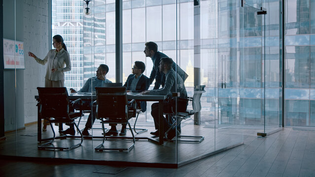 Business team collaborating on interactive data dashboards in modern office with analytics overlays