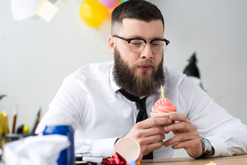 Colleagues celebrating birthday with cupcakes and fun in modern office