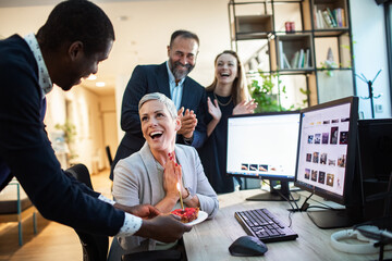 group of colleagues surprising female colleagues with birthday cake and party at work in office. surprise, birthday party at work. casual business