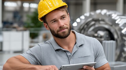Young Male Worker with Yellow Hard Hat Using Tablet in Modern Industrial Setting