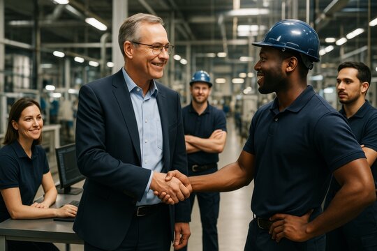 Business executive shaking hands with factory worker in industrial setting, surrounded by smiling team in a bright modern background. Ai generative