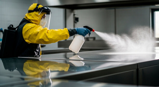 Person in Protective Suit Sanitizing Commercial Kitchen Surfaces