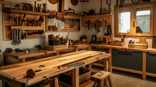 Empty Wooden Table Surrounded By Tools In An Artisan Workshop Setting