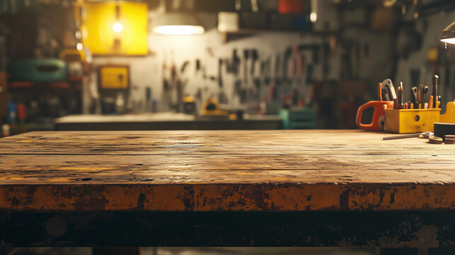 A wooden table with a vacant space and the interior of a repair shop in the background