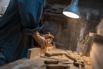 Handmade concept. Workshop on wood. Women's hands create a product made of wood