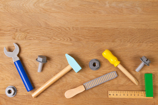 Workshop scene. Old tools hanging on wall in workshop, Tool shelf against a table and wall, vintage garage style