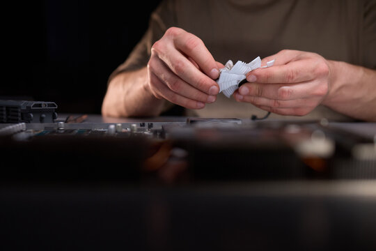 A technician is skillfully repairing a computer GPU fan with precision tools in a workshop