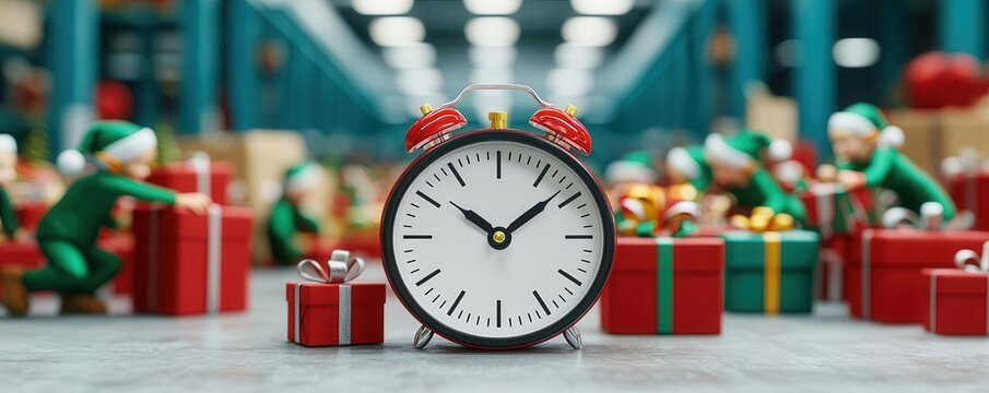 Santa s workshop with a clock prominently displayed, elves in a rush to finish wrapping presents, Santa's workshop under time pressure, Christmas eve urgency