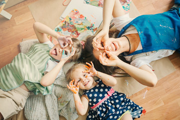 Happy mom and her child  playing with finger paint . Games with children with paint.Early  development.Spend  time with  kids.