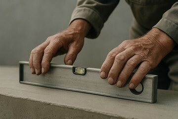 Skilled hands using a spirit level to measure and align a concrete surface for precise construction and accurate setup