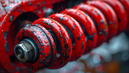 Close-up view of a red metallic coil spring with black speckles in an industrial setting