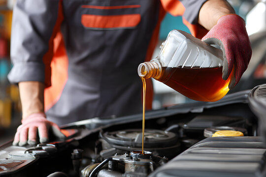 A person in blue gloves pours engine oil into a car's engine. The scene is set in a garage with a focus on vehicle maintenance and care.