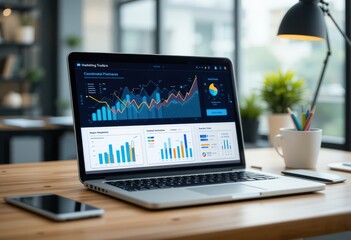 Laptop displaying colorful charts and graphs, perfect for data analysis, business trends, and financial reports in a modern workspace.