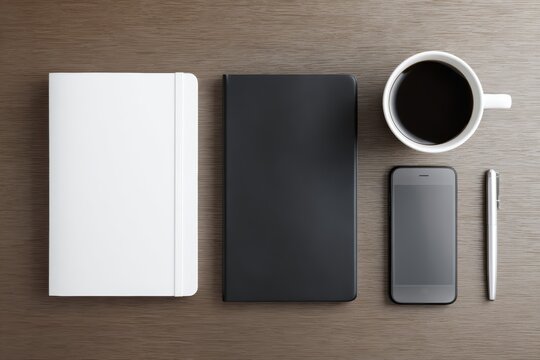 Minimalist wooden desk with coffee cup, a serene workspace for focused productivity