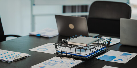Side view picture of studio workplace with blank notebook, laptop. Comfortable work table, home office.
