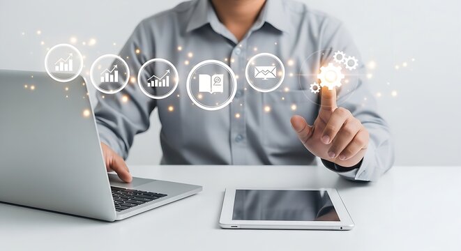 Man interacting with digital icons over laptop and tablet on a white desk in a bright office space