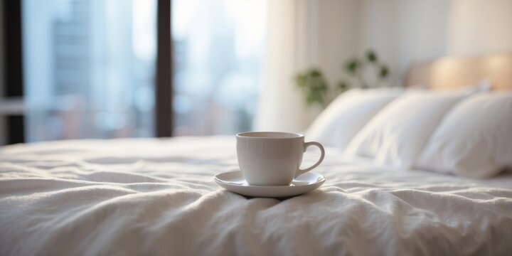 A white blanket covers the white bed Nearby, a table holds a cup of coffee.