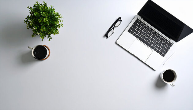 Overhead View of a Minimalist Workspace with Laptop and Coffee, Clean White Desk with Tech and Plant, Modern Work From Home Essentials