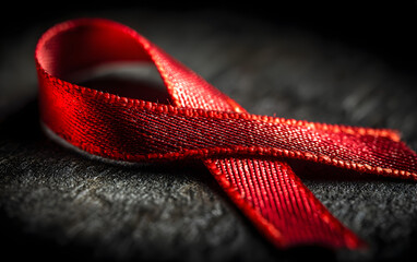 Closeup red ribbon HIV, world AIDS day awareness ribbon on black background. Healthcare and medicine concept.