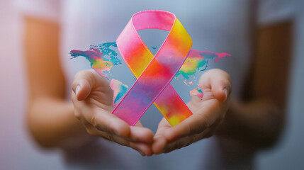 A woman holding a pink ribbon with a globe in the background, representing world cancer day awareness