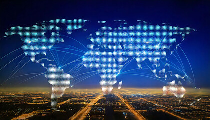 Digital world map overlay on urban cityscape highlighting global connectivity