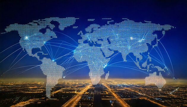 A stylized world map with interconnected nodes, symbolizing global connectivity through technology