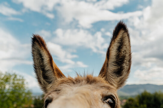Donkey showing its big ears under a cloudy sky, celebrating world donkey day on may 8th