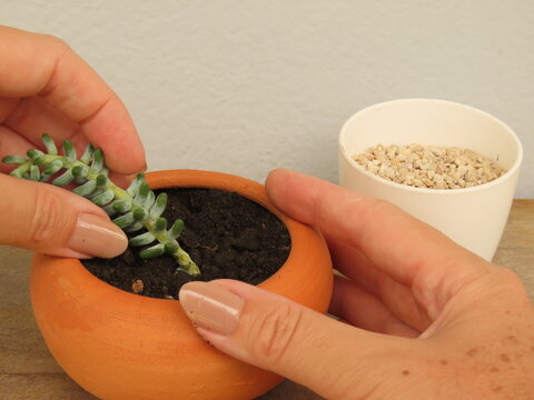 Woman hands placing a stem cutting of a Burro's tail in the soil of a brown ceramic pot. Hands holding a stem cutting to plant. Woman hands planting a plant. Gardening concept.