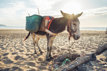 Young donkey grazing in a mountain pasture, emphasizing animal health and farm management, World Animal Day