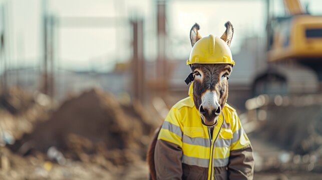 Against the blurred outlines of a construction site, a donkey in a safety jacket and yellow helmet stands alert, epitomizing the essence of World Safety Day.