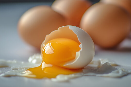 Playful flat design of cracked egg with yellow yolk dripping. Perfect for World Egg Day, food concepts, and culinary themes.