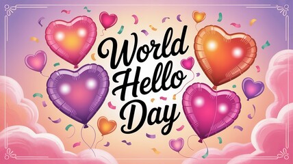 Creative design celebrates World Hello Day with vibrant colors and hearts.