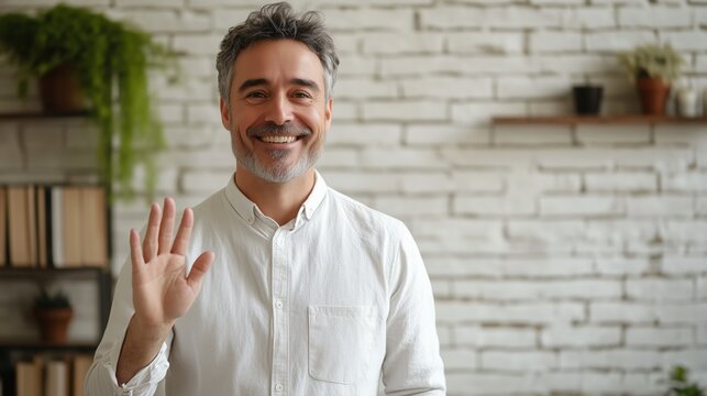A happy man greets passersby with enthusiastic waves from behind a wall