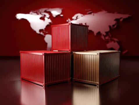 A visually striking image of three shipping containers in red and silver, set against a world map backdrop, symbolizing global trade and logistics.
