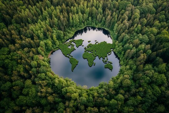 Forest seen from above with trees forming the continents of the world, emphasizing global unity and the need for environmental conservation to preserve nature’s beauty for future generations.
