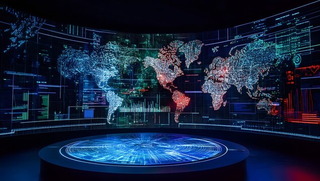 Immersive digital projection of a global network overlaying a world map with intricate data streams and futuristic technology in a dark modern environment