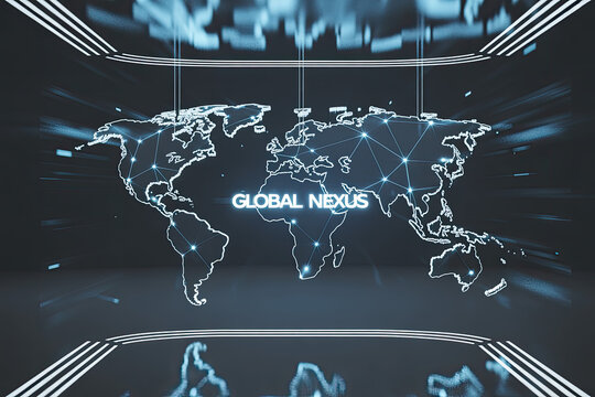 Futuristic digital world map with glowing connections and data streams in a dark environment