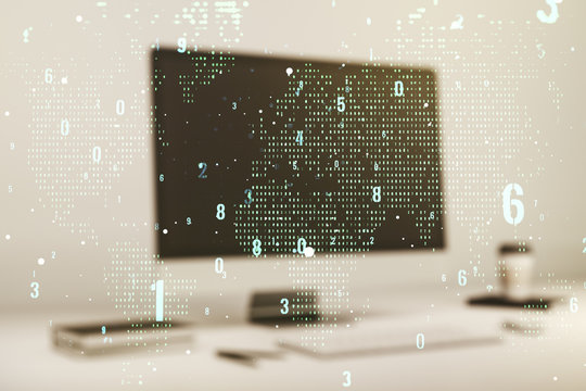 Financial data processing on world map with digital code