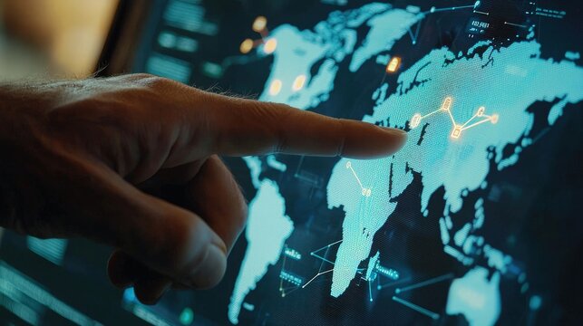 A hand points to a location on a digital world map.