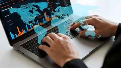 Global Market Analysis: A digital world map overlaid with financial data and charts.