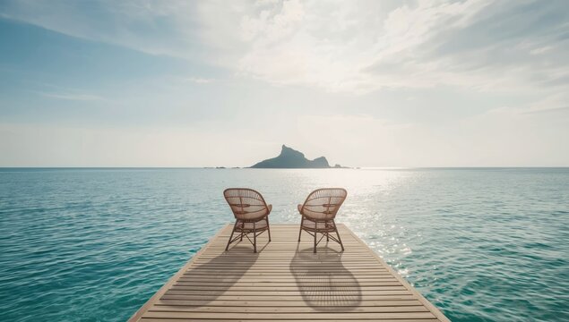 A pair of rattan chairs positioned on a wooden dock overlooking a peaceful sea with a tiny island, suitable for leisure, World Oceans Day
