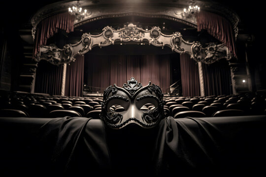 World Theater Day. A dark still life with theatrical elements: A mask placed on the seats in the auditorium in front of the stage.