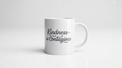 Closeup of a white coffee mug with the inspirational quote kindness is contagious on the side, a motivational message to spread positivity and kindness, isolated on white background