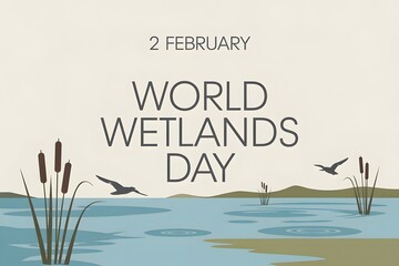 Typography world wetlands day february 2 with swamps, lotus flowers, and birds in natural scenery, creative illustration design
